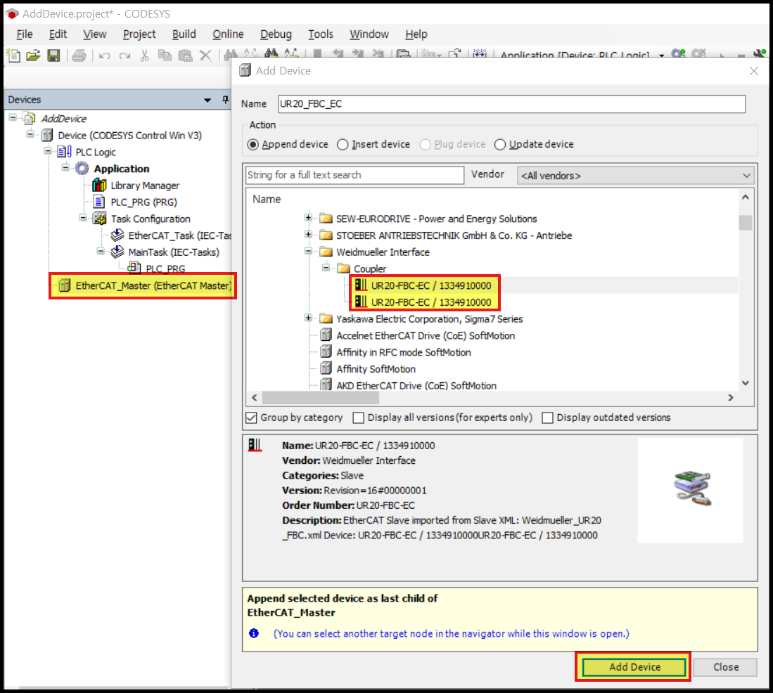 [EtherCAT_Master] 를 선택하고 [Add Device] 를 클릭하면, 추가 가능한 EtherCAT 장치들이 나옵니다.