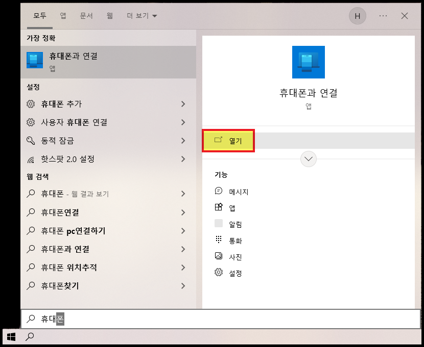 윈도우 버튼 옆의 검색창에 "휴대폰"을 입력하면 이와 같이 [휴대폰과 연결] 앱이 나타납니다.