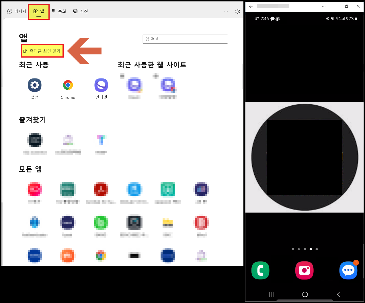 [앱] 화면에 있는 [휴대폰 화면 열기] 를 클릭하면, 내 휴대폰 화면을 그대로 컴퓨터에서 볼 수 있습니다.